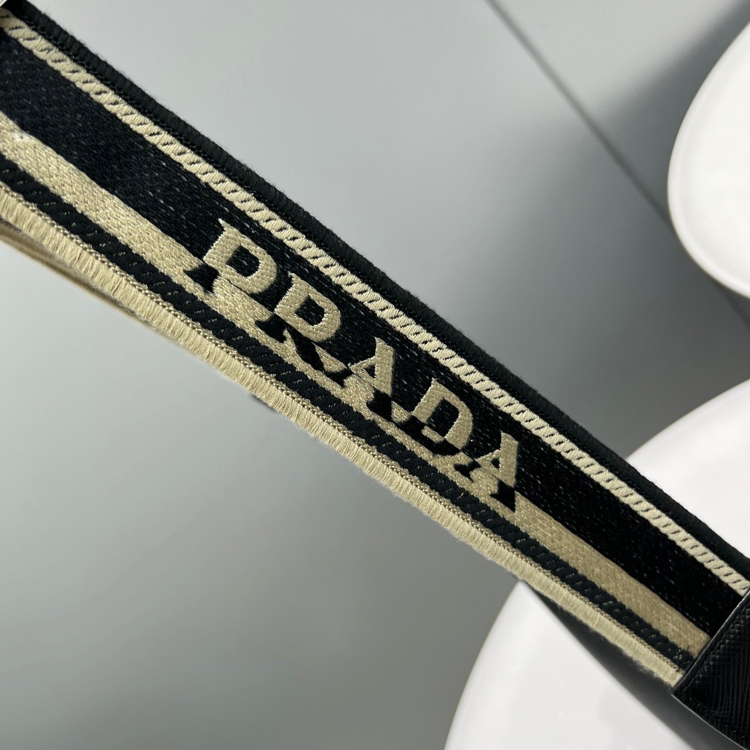 Detachable, adjustable shoulder strap in embroidered webbing and leather